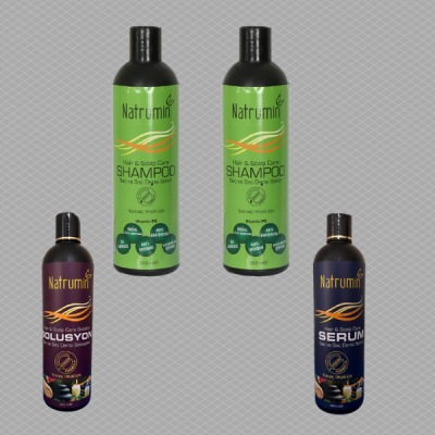 Natrumin Saç Bakım Seti saç ve saç derisi sorunlarında daha kısa sürede etki görmenizi sağlar. Natrumin 4’lü set kullandıktan sonra Natrumin Şampuan Plus ya da Natrumin Şampuan ürünleri ile devam ederek sorunun tekrarlanması engellenebilir. Natrumin Şampuan ürünleri günlük temizlik ve saç bakımı için de kullanılabildiğinden ve inorganik kimyasal içermediğinden herhangi bir zararı olmaz. Dermatolojik testleri Almanya Dermatest Laboratuarlarında yapılmıştır. Natrumin Şampuan, saç dökülmesine bitkisel çözüm sunar. Saç derisi sorunları, saç dökülmesi, incelme, erken beyazlama, kırılma gibi saç ve saç derisi sorunlarında ve günlük saç bakımında kullanılabilir.