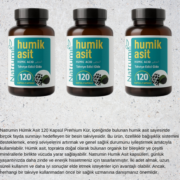 NATRUMIN Humik Asit Kapsül; doğadan elde edilen humik ve fulvik asit içeriğiyle, vücudun doğal işleyişini desteklemeye yardımcı olan bir takviye edici gıdadır.